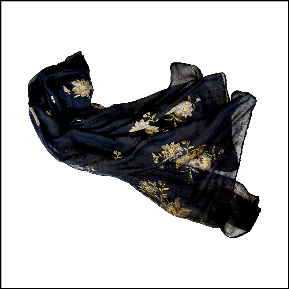 A luxurious navy blue scarf adorned with golden embroidery — elegant, striking, and made to stand out.